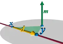 A line L in 3-dimensional Euclidean space is determined by two distinct points that it contains, or by two distinct planes that contain it. Consider the first case, with points x = (x1,x2,x3) and y = (y1,y2,y3). The vector displacement from x to y is nonzero because the points are distinct, and represents the direction of the line. That is, every displacement between points on L is a scalar multiple of d = y − x. If a physical particle of unit mass were to move from x to y, it would have a moment about the origin. The geometric equivalent is a vector whose direction is perpendicular to the plane containing L and the origin, and whose length equals twice the area of the triangle formed by the displacement and the origin. Treating the points as displacements from the origin, the moment is m = x × y, where "×" denotes the vector cross product. For a fixed line, L, the area of the triangle is proportional to the length of the segment between x and y, considered as the base of the triangle; it is not changed by sliding the base along the line, parallel to itself. By definition the moment vector is perpendicular to every displacement along the line, so d ⋅ m = 0, where "⋅" denotes the vector dot product.