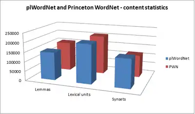 Currently, plWordNet contains 148k lemmas, 207k lexical units and 151k synsets.[5] It has already outgrown Princeton WordNet with respect to the number of lexical units. plWordNet consists of nouns (116k), verbs (18k) and adjectives (13k).[5] Each meaning of a given word is a separate lexical unit. Units that represent the same concept, and do not differ significantly in stylistic register, have been combined into synsets - sets of synonyms. Each lexical unit is assigned to one of the domains (semantic categories), indicating its general meaning. plWordNet domains correspond to Princeton WordNet lexicographers’ files.