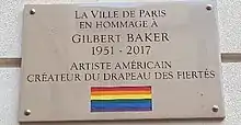 The oficial plaque in memory of Gilbert Baker, voted unanimously by the Council of Paris,[3] is situated on a wall of the square.[4]