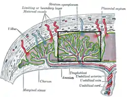 ![]() Structure of the placenta, with a placental cotyledon marked in rectangle. | |