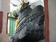 A famous temple built in the 16th century during the rule of Kempegowdas, is the Bull temple or the Nandi Temple (‘Nandi' in Sanskrit means ‘joyful') made of granite. This temple built in 1537 on a hill top with a porch in the Vijayanagara architectural style is named after the large granite Nandi monolith placed on a plinth in the temple shrine. The temple is exclusive for the worship of the sacred bull in Hinduism, known as Nandi, Lord Shiva's vahana, or animal mount. Nandi idol at this temple is said to be one of the largest in the world, with height of about 15 ft (4.6 m) and 20 feet (6.1 m) length. Temples for Dodda Ganapathy (huge Ganesha -– 10 ft (3.0 m) height & 15 ft (4.6 m) wide) and for Lord Shiva, a little above the Ganesha temple, are also located at the foot of the hill. A groundnut fair called Kadalekay Parishe in Kannada language, which is linked to a popular folklore legend, is held by farmers every year during November to thank Nandi for the good yield of this crop and to seek further blessings.[15][16][17][18]