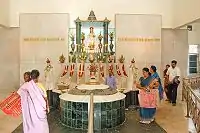 Infant Jesus Church at Vivek Nagar, which is now the biggest church in Karnataka and a popular pilgrimage centre, has a long history of sacrifice and devotion. The Church was first conceived by Fr. Paul Kinatukara in the sixties and the foundation was laid in April 1970 by Rev. Dr. Lourduswamy, the then Archbishop of Bangalore. The missionary zeal (in spite of daunting hurdles) of Fr. L. Peter established the church on a firm footing and the church was opened to devotees in the year 1979, to honour and glorify the divine Infant Jesus of Prague. Designed by the Architects of Thomas Associates, the church with a fan shaped hall can accommodate about 2500 people. It has 9 faces and openings running all round the church. People seated anywhere in the interior of the church feel that the altar is facing them. The podium is raised above road level with steps and ramp on either side. The replica of the nativity scene in the nativity church of Jerusalem is the main mural of size 6 mi (9.7 km)x 9 mi (14.5 km). The remarkable feature of the church is the secular nature of the devotees who throng seeking blessings, particularly on Thursdays and Saturdays. St Mary's Feast is celebrated in September every year when devotees gather at the Church dressed in saffron colour.[23][39][40]