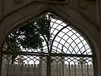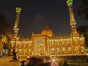 Jamia Masjid, situated near the City Market, is the most impressive mosque in Bangalore. Designed by Rayyaz Asifuddin of Hyderabad, India, it was built in 1940 with white marble from Rajasthan and is dedicated to Tipu Sultan. This landmark has bulbous domes, twin towers standing on exquisitely carved granite pillars and fashioned jali work in the balcony. It is a five–storeyed structure, with space to accommodate up to 10,000 devotees. With an ablution pool in the centre of mosque, the ambiance inside the mosque is cool, serene and airy. In the elevated prayer hall of the mosque, beautiful bubris (frescoes) that bear mark of Tipu Sultan have been revealed, after removing the old plaster. Muslims in large numbers congregate here during the death anniversary of Tipu Sultan, to mark the "Tipu Urs".[23][24][25]