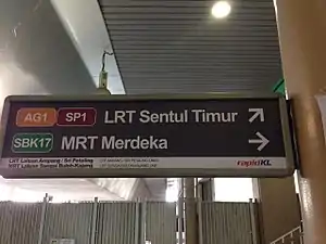 ![]() Station signage at the station denoting the directions to the platforms of the LRT station and the Merdeka MRT station. | ||||||||||||||||