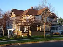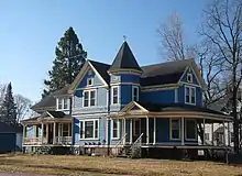 - The Eli Winch house (at left in top photo) at 201 S. Vine Ave. is a classic Queen Anne style house, built in 1897 by Hans Billie, an important builder in Marshfield at the time. Characteristic features of Queen Anne are the asymmetry and complex roof. Also characteristic of Queen Anne are the bay windows, the wraparound porch, and the varied surface textures and colors with the clapboard alternating with bands of shingles. Winch owned the Marshfield Stave Factory just across the railroad tracks on Cherry[9] and was a state legislator.[2][10]