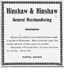 In 1897, brothers Emmett and Jeremiah Hinshaw purchased a general merchandise business in Plevna, Kansas. They named the business "Hinshaw and Hinshaw General Merchandising."[5]