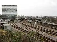 The rebuilding work was resumed in 1956 to the designs of architect Howard Cavanagh and Ian Campbell[8] and the new station with its large office block, 'Intercity House', was formally opened by Dr Richard Beeching, the British Railways Chairman, on 26 March 1962.[5][6] The office block was intended to be the northern point of Armada Way, counterbalancing the tower of the Civic Centre at the southern end, in the Abercrombie/Paton-Watson 'Plan for Plymouth'.[9] The station now had seven through platforms, although two of these were converted to terminal bay platforms in 1974. One of these at the west end is usually used for the Tamar Valley Line service[10] but the longer east end bays were used for parcels and for Royal Mail trains until the withdrawal of this traffic from the area in 2003. Outside the station a car park was provided, which was rebuilt in its current multistorey form in the 1970s.[6] In recent times there have been updates to the station.[11]