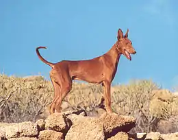 The Podenco Canario is a very agile, slender and lightly built but sturdy dog. There are two distinct sizes of Podenco Canarios. One is similar to the Ibizan Hound, medium in size, with height at the withers approximately 55 to 64 cm (21.7 to 25.2 ins) for males, females are slightly smaller. Sizes vary with the terrain on which the dog hunts.[1] A second smaller size Podenco Canario has been recognised within the Canary Islands, with height at the withers approximately 30 to 40 cm for males, females slightly smaller. The short, dense coat should be some shade of red, white, or a combination of red and white, depending on the island and, in some cases, the specific area on some of the islands. There should be no other colour on the coat, or indeed anywhere on the body, as even the dog's nose, nails and skin should be a shade of red, and they are even known to "blush" when excited. The neck is long, the head is longer than it is wide, and the large ears are carried fully up. The long tail is usually seen low set but can be raised. The tail is not carried too high when moving. The dog should move in an extended and agile trot. Faults, which indicate that a particular dog should not be bred, include aspects of appearance as well as structural faults that would prevent the dog's ability to move and hunt, such as cow hocks, and crossing of the fore and hind legs at a trot.[1]