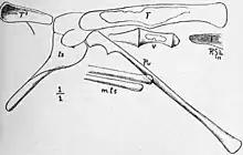The humerus was small and very delicate, 42 mm (1.7 in) long, less than half the length of the femur. It had a strong processus lateralis (a process directed to the side) 30 mm (1.2 in) above its lower end. Lull found it similar to that of Ornitholestes, apart from the radial crest (that connected with the radius bone of the lower arm) not being as high, showing little muscular power. Von Huene estimated the radius to have been 30 mm (1.2 in) long. Lull found the hand more similar to that of Compsognathus than of Ornitholestes.[8][6][7] Only slender phalanx bones of the three fingers were preserved, including sharp, curved claws.[7] The pubis was very long, expanding both at the front and hind ends. It was 6 mm (0.24 in) wide and 95 mm (3.7 in) long, and its lower expansion was 10 mm (0.39 in) in diameter. Talbot found the pubis similar to that of the then undescribed Procompsognathus. Lull argued that the pubis lay approximately in position in the fossil, pointing forwards.[8][6] Heilmann instead believed the bone had been moved out of position before burial, and would have been directed backwards.[12] Colbert and Baird suggested the pubis was directed forwards, but that it curved slightly upwards instead of downwards due to natural warping and cracking of the bone. The ischium was 55 mm (2.2 in) long, 15.5 mm (0.61 in) wide at the end closest to the body, and its slender shaft was 4 mm (0.16 in) in diameter, and somewhat thickened at its lower end. Lull found it similar to those of Compsognathus and Ornitholestes. Below the acetabulum (where the femur connects with the pelvis) there was a broad lamella running towards the pubis.[6][7]