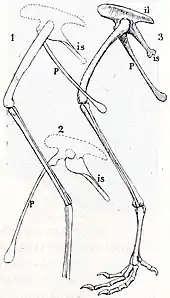 The femur was slender, nearly straight, had thin walls, and was expanded at the back side of its lower end. It was 86 mm (3.4 in) long and 6.5 mm (0.26 in) in diameter just below the fourth trochanter (a flange placed mid-length at the back of the femur). The fourth trochanter was strong, 18 mm (0.71 in) long and about 2 mm (0.079 in) high, and was situated past the middle of the shaft, towards the lower end. The condyles (round prominences) of the femur's lower end protruded strongly hindwards. The tibia was a thin, narrow shaft, 104 mm (4.1 in) in length, and about 7 mm (0.28 in) in diameter. Talbot stated the very thin fibula lay close to the tibia and was of almost equal length, while von Huene thought this was instead part of the crushed tibia. The three metatarsals of the lower leg were closely appressed together forming a compact structure, similar to what was seen in Ornithomimus, but not fused into a tarsometatarsus, as seen in birds. The length of the metatarsals was 75 mm (3.0 in), while their width was 9 mm (0.35 in). The most complete pedal phalanx was very slender and 12 mm (0.47 in) long.[6][8][7]