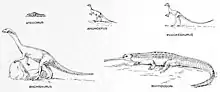 Shufeldt elaborated on his and Heilmann's interpretation of the pubis in 1915, and stated the bone had probably been displaced during fossilization. He pointed out that if it had faced forward, it would have been in forcible contact with the abdominal ribs that would have been dangerous for internal organs during movement.[11] Lull found Heilmann and Shufeldt's criticisms of his pelvis reconstruction probable in 1915. He listed Podokesauridae under the superfamily Compsognatha, and suggested Podokesaurus was perhaps ancestral to the later North American genera Ornitholestes and Ornithimimus.[6] In 1916, Heilmann pointed out that early dinosaurs, parasuchians, and pterosaurs all had similarities to birds, as well as to each other, and that Triassic reptiles like Scleromochlus, Saltopus, and Podokesaurus, were difficult to separate. He proposed that Podokesaurus and other bipedal reptiles from the Triassic were descended from pseudosuchians (which many types of archosaurs were classified as at the time) that may have evolved bipedality by the Permian. He concluded that birds were descended from ornithosuchian pseudosuchians rather than from dinosaurs, due to their bipedality and bird-like legs.[25] The paleontologist Henry Fairfield Osborn used Podokesaurus as an example of a "carnivorous dinosaur of the bird-like type" in 1917, while stating that similarities between birds and dinosaurs were due to parallel evolution.[26] The paleontologist Franz Nopcsa von Felső-Szilvás created the subfamily Podokesaurinae in 1928, within which he included Podokesaurus, Procerosaurus, Saltopus, and Tanystropheus.[27] Von Huene grouped Podokesaurus, Coelophysis, Spinosuchus, Halticosaurus, Saltopus, Avipes, and Velocipes in Podokesauridae in 1932.[28]