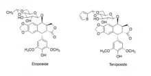 Podophyllotoxin destabilizes microtubules by binding tubulin and thus preventing cell division.[19][20] In contrast, some of its derivatives display binding activity to the enzyme topoisomerase II (Topo II) during the late S and early G2 stage. For instance, etoposide binds and stabilizes the temporary DNA break caused by the enzyme, disrupts the reparation of the break through which the double-stranded DNA passes, and consequently stops DNA unwinding and replication.[21] Mutants resistant to either podophyllotoxin, or to its topoisomerase II inhibitory derivatives such as etoposide (VP-16), have been described in Chinese hamster cells.[22][23] The mutually exclusive cross-resistance patterns of these mutants provide a highly specific means to distinguish the two kinds of podophyllotoxin derivatives.[23][24] Mutant Chinese hamster cells resistant to podophyllotoxin are affected in a protein P1 that was later identified as the mammalian HSP60 or chaperonin protein.[25][26][27] Furthermore, podophyllotoxin is classified as an arytetralin lignan for its ability to bind and deactivate DNA.[28] It and its derivates bind Topo II and prevent its ability to catalyze rejoining of DNA that has been broken for replication. Lastly, experimental evidence has shown that these arytetralin lignans can interact with cellular factors to create chemical DNA adducts, thus further deactivating DNA.[28]