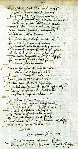 The major corpus of Medieval Scottish Gaelic poetry, The Book of the Dean of Lismore was compiled by the brothers James and Donald MacGregor in the early decades of the sixteenth century. Beside Scottish Gaelic verse it contains a large number of poems composed in Ireland as well verse and prose in Scots and Latin. The subject matter includes love poetry, heroic ballads and philosophical pieces. It also is notable for containing poetry by at least four women.[16] These include Aithbhreac Nighean Coirceadail (f. 1460), who wrote a lament for her husband, the constable of Castle Sween.[17] The first surviving major text in Scots literature is John Barbour's Brus (1375), composed under the patronage of Robert II and telling the story in epic poetry of Robert I's actions before the English invasion till the end of the war of independence.[18] The work was extremely popular among the Scots-speaking aristocracy and Barbour is referred to as the father of Scots poetry, holding a similar place to his contemporary Chaucer in England.[19]