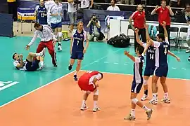 They began season with intercontinental round of World League 2015. First match with Russia, Poland won 3–0.[57] Most Valuable Player of match was Mateusz Bieniek, who played his first match in senior national team. After break to national team returned a few players – Bartosz Kurek, Jakub Jarosz, Grzegorz Łomacz, Piotr Gacek, Wojciech Grzyb. Next day, Poland beat Russia in five-set match (3–2). Most Valuable Player of match was Bartosz Kurek (23 pts).[58] On 5 June 2015 Poland beat Iran (3–1).[59] Bartosz Kurek scored 30 pts and he was Most Valuable Player of match. Next day, Poland won another meeting with Iran (3–2) and MVP was chosen Michał Kubiak.[60]On 12 June 2015 Poland lost first match with United States (3–2) after almost 3 hours meeting.[61] It was first lost match of Poland since 10 September 2014, when they lost with U.S. national team at World Championship. Next day, Poland also lost with American players (3–1). After spending one week in United States, Poland moved to Russian ground – Kazan, where won two matches against Russia (3–1) and (3–2).[62][63] Then they flew to Tehran. After a spectacular meeting, Poland lost first match on 26 June (3–2). Two days later, Polish national team beat Iran (3–1). Polish team spent three weeks in tour and they came back to Poland on last matches of intercontinental round with United States. On 3 July 2015 Poland beat USA in tie-break and achieved two points, which gave Polish team a qualification to final round of World League 2015 in Rio de Janeiro. Next day, they lost match (1–3). Poland qualified for the Pool J with Serbia and Italy. On 17 July Poland won match over Italy (3–1) and qualified to semi-final.[64] Main leader in this important meeting was Michał Kubiak, who scored 19 pts. Next day, Serbia won over Poland (2–3), but Polish team gained 1 pt and took first place in Pool J. On 18 July, Poland lost semi-final with France (2–3). On 19 July Poland did not achieve bronze, because of lost with USA (0–3).[65] Polish team had problems with own errors. Poland took 4th place in edition of the World League 2015. Polish players achieved two individual awards – Michał Kubiak was one of the Best Outside Spiker and Paweł Zatorski was Best Libero. In 2–9 August all players, whose were in final round in Rio de Janeiro went to training camp in Arłamów and two players joined to team (Włodarczyk, Kłos). Then the team without Wrona was training in Spała.