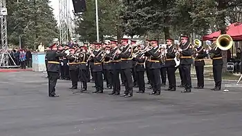First concert of the Police Band was in Cultural Center Banski Dvor on November 21, 2018. Reason for the concert was slava of the Ministry of Interior of Republika Srpska Saint Archangel Michael.[15] On concert were also short video clips from the history of the Police and the Ministry of Interior of Republika Srpska and short movie about first year of work of the Police Band produced by Radio Television of Republika Srpska.[15][16][17] On first concert in Banja Luka, Police Band played this compositions: Moja Republika (National anthem of Republika Srpska), Bože pravde (National anthem of Serbia), marches National Heroes, Radetzky March, Miloš the Great, Alexander I, March on the Drina, patriotic songs, Kreće se lađa francuska, Tamo daleko, music from the movie Povratak otpisanih, The Final Countown, Devojko mala, Dancing Queen, Uptown Funk and Pukni zoro sung by alt saxophonist Srđan Vasić.[17]