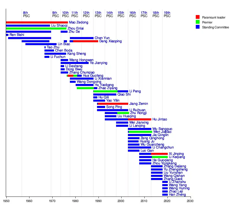 - 8th PSC (elected September 1956): Mao Zedong, Liu Shaoqi, Zhou Enlai, Zhu De, Chen Yun, Lin Biao (X), Deng Xiaoping