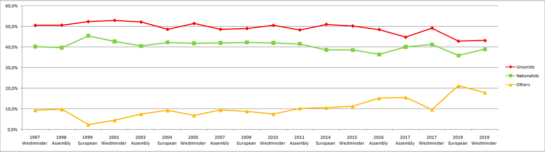 - 2019 Westminster election – unionists 43.2%, nationalists 38.9%, others 17.9%