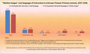 Before 1921, there were 514 Belarusian language schools in West Belarus.[66] In 1928, there were only 69 schools which was just 3% of all existing schools in West Belarus at that moment.[67] All of them were phased out by the Polish educational authorities by 1939.[68] The Polish officials openly prevented the creation of Belarusian schools and were imposing Polish language in school education in West Belarus.[69] The Polish officials often treated any Belarusian demanding schooling in Belarusian language as a Soviet spy and any Belarusian social activity as a product of a communist plot.[70]