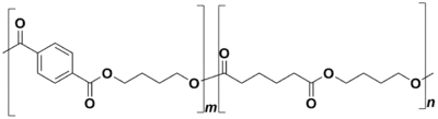 PBAT (short for polybutylene adipate terephthalate) is a biodegradable random copolymer, specifically a copolyester of adipic acid, 1,4-butanediol and terephthalic acid (from dimethyl terephthalate). PBAT is produced by many different manufacturers and may be known by the brand names ecoflex, Wango, Ecoworld, Eastar Bio, and Origo-Bi. It is also called poly(butylene adipate-co-terephthalate) and sometimes polybutyrate-adipate-terephthalate[1] (a misnomer) or even just "polybutyrate".[2] It is generally marketed as a fully biodegradable alternative to low-density polyethylene, having many similar properties including flexibility and resilience, allowing it to be used for many similar uses such as plastic bags and wraps.[3] The structure of the PBAT polymer is shown to the right. It is depicted as a block co-polymer here due to the common synthetic method of first synthesizing two copolymer blocks and then combining them. However, it is important to note that the actual structure of the polymer is a random co-polymer of the blocks shown.