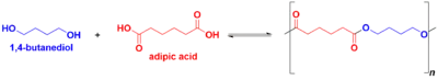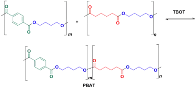 Adipic acid and 1,4-butanediol are polymerized to create their polyester (plus water). DMT and 1,4-butanediol are also reacted to form their polyester (plus methanol). This polyester is then added to the butylene adipic acid polyester by using tetrabutoxytitanium (TBOT) as a transesterification catalyst; an overabundance of 1,4-butanediol influences chain lengths. The result is a copolymer of the two previously prepared polymers.