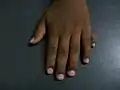 This is the most common situation, in which the extra digit is on the ulnar side of the hand, thus the side of the little finger. This can also be called postaxial polydactyly. It can manifest itself very subtly, for instance only as a nubbin on the ulnar side of the little finger, or very distinctly, as a fully developed finger. Most commonly, the extra finger is rudimentary, consisting of an end phalanx with a nail, and connected to the hand with a small skin pedicle. Mostly one neurovascular bundle can be identified, with no tendons present in the extra digit. In case of a fully developed extra finger, the duplication usually presents itself at the level of the metacarpophalangeal joint. A triplication of the little finger is very rare. Ulnar polydactyly occurs ten times more often in African populations.[11] The incidence in Caucasians is reported as 1 in 1,339 live births, compared with 1 in 143 live births in Africans and African Americans. Ulnar polydactyly is also often part of a syndrome.[11] In patients with African ancestry ulnar polydactyly mostly occurs isolated, whereas the presentation in Caucasians is often associated with a syndrome,[8] though in a retrospective review, only 4 of 37 cases of ulnar polydactyly in Caucasians were syndromic.[12] In almost 14% of all patients, this type of polydactyly is hereditary. It usually passes on in an autosomal dominant manner with variable expression and incomplete penetrance. It is genetically heterogenic, meaning that mutations in different genes can be the cause. When the extra digit is pedicled it can be very movable; however, injuries are rare and have never been reported so far.