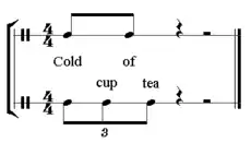 Similar phrases for the 4 against 3 polyrhythm are "pass the golden butter"[1] or "pass the goddamn butter"[32] and "what atrocious weather" (or "what a load of rubbish" in British English); the 4 against 3 polyrhythm is shown below.