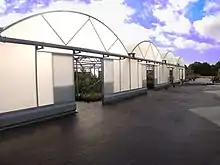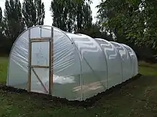 A polytunnel (also known as a polyhouse, hoop greenhouse or hoophouse, grow tunnel or high tunnel) is a tunnel typically made from steel and covered in polyethylene, usually semi-circular, square or elongated in shape. The interior heats up because incoming solar radiation from the sun warms plants, soil, and other things inside the building faster than heat can escape the structure. Air warmed by the heat from hot interior surfaces is retained in the building by the roof and wall. Temperature, humidity and ventilation can be controlled by equipment fixed in the polytunnel or by manual opening and closing of vents. Polytunnels are mainly used in temperate regions in similar ways to glass greenhouses and row covers. Besides the passive solar heating that every polytunnel provides, every variation of auxiliary heating (from hothouse heating through minimal heating to unheated houses) is represented in current practice. The nesting of row covers and low tunnels inside high tunnels is also common.[1]