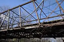 The Ponakin Bridge is a historic Post truss bridge spanning the Nashua River in northern Lancaster, Massachusetts. The bridge was built in 1871, and originally carried the main north–south road (now Ponakin Road), which was bypassed by the construction of Massachusetts Route 70.[2] It is now unsafe and closed even to pedestrians. The bridge, with a design once common but now extremely rare, was listed on the National Register of Historic Places in 1979.[1]