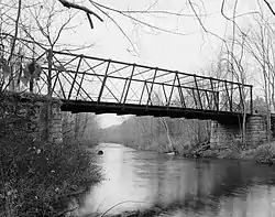 The bridge was built in 1871 for town by the Watson Manufacturing Company of Paterson, New Jersey. It was built at a location where wooden bridges had stood since the 17th century, on the major road leading north from Lancaster. The route was bypassed by the present alignment of Route 70 in 1965. The bridge design was patented about 1866 by Simon S. Post, and was one of the major bridge forms used in developing the national railroad network, including major crossings such as that of the Union Pacific Railroad over the Missouri River.[2] The bridge deck is now compromised, and the bridge has been closed to all forms of traffic.