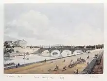 The architect Jean-Rodolphe Perronet was commissioned in 1787 with this new bridge. It had been planned since 1755, when construction of "place Louis XV" (now "place de la Concorde") began, to replace the ferry that crossed the river at that point. Construction continued in the midst of the turmoil of the French Revolution, using the dimension stones taken from the demolished Bastille (taken by force on 14 July 1789) for its masonry. It was completed in 1791.[1][2]