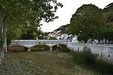 The silted margins of the river, in an area 15 metres (49 ft) from the bridge, are important habitats for waterfowl and species. The presence of European alder (Alnus glutinosa), Poplar (Populus), Willow (Salix) and Reed bed provides a habitat for various species of Spanish pond turtle (Mauremys leprosa), Viperine water snake (Natrix maura), Mallards (Anas platyrhynchos), Muscovy ducks (Cairina moschata), Greylag goose (Anser anser), Grey wagtail (Motacilla cinerea) and the Common nightingale (Luscinia megarhynchos).[1] Along the banks are various aromatic plants, such as Rosemary, Lavander and Mint.[1] To the east stretches a fertile floodplain, used for cultivating sweet potato and corn, and as pasturelands for dairy cattle. Downstream are vestiges of the ancient fluvial port with mooring posts, and a cisterns that was situated near the (now disappeared) inn and tollhouse.[1] To the west of the bridge, near the entrance to the south, is the old village grocery, while to the east (and few meters away) is the municipal market.[1]