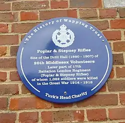 | 17th (County of London) Battalion, London Regiment (Poplar and Stepney Rifles) Tower Hamlets Rifles, The Rifle Brigade 656th Light Anti-Aircraft Regiment, Royal Artillery (Tower Hamlets) TA | |