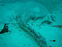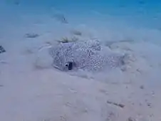 The porcupine ray can sometimes be observed lying still on the bottom in the open or inside caves.[5] It is known to form groups at Ningaloo Reef.[2] Its diet consists primarily of sipunculids, polychaete worms, crustaceans, and bony fishes.[12][13] When feeding, it plows deeply into the bottom, expelling excess sediment from its spiracles in a plume visible from a long distance away.[2] Parasites documented from this ray include the tapeworm Rhinebothrium devaneyi, the nematode Echinocephalus overstreeti,[15] and the capsalid monogeneans Dendromonocotyle urogymni[16] and Neoentobdella baggioi.[17] The porcupine ray is aplacental viviparous, with the developing embryos sustained to term by histotroph ("uterine milk") secreted by the mother.[9] Mangrove forests serve as important habitat for juvenile rays.[18] Males and females mature sexually at about 90 and 100 cm (35 and 39 in) across, respectively.[2]