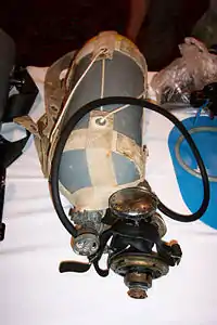 This was the first single-hose open-circuit scuba made in the world. Ted Eldred in Melbourne in Australia started designing it in 1948 to "design around" the Cousteau-Gagnan aqua-lung patent, and to get rid of air supply restrictions that affected early Cousteau-Gagnan-type aqua-lungs. He started making it commercially in 1952. The Royal Australian Navy adopted it. It was the origin of single-hose scuba regulators. It was much used by Australian scuba divers. The picture shows the CA-1, a set with one cylinder with its valve at the bottom, strapped directly to the back with rucksack-type straps without backpack plate or buoyancy aid, with a single-hose regulator-mouthpiece which could be strapped in. The tank was inverted so that the diver could reach the regulator mounted reserve handle. The head strap was intended to keep the demand valve from falling well below the diver, if dropped from the mouth. The high-pressure regulator screwed into the side of the cylinder valve like welding equipment of today; there was no A-clamp. Versions of it were made for the Australian Navy until 1976, and the last one known to be sold to the public was sold in that year. About 12,000 Porpoise units of all models were produced. About 50 Porpoises still exist. Only a few of these early models are known today, the rarest being the CA-2, made for use with two tanks.
