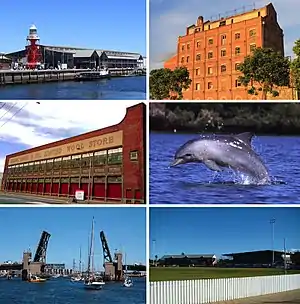 ![]() Clockwise, from top: Port Adelaide Lighthouse and Fishermen's Wharf Market, Hart's Mill, Port River Dolphin, Alberton Oval, Birkenhead Bridge, Wool Stores | |||||||||||||||