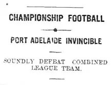 The Port Adelaide v South Australia (1914) exhibition match played between Port Adelaide and the South Australian state team was an Australian rules football match played at the Jubilee Oval on 14 October 1914.[1] The match saw one of seven South Australian Football League (SAFL) clubs in Port Adelaide take on a composite team of players from the remaining 6 clubs. Port Adelaide won the match by 58 points.[2]