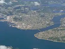 The Narrows divide the city of Bremerton into east and west portions, which are connected by the Manette Bridge and the Warren Avenue Bridge. There are a number of petroleum distribution facilities with storage tanks and receiving wharves along the western shore of the Narrows between the Manette Bridge and Phinney Bay.