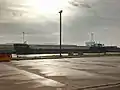 The port plays a major role in the region's energy production.[20] British Gas Hydrocarbon Resources Limited operates a condensate-storage site in Ramsden Dock, through which the liquid by-product of gas production at the nearby Rampside Gas Terminal is exported.[4] The PNTL vessel Pacific Heron is based at the port of Barrow, and is used to transport nuclear material between nearby Sellafield and Japan.[21] The port also played an important role in the construction of the Barrow Offshore Wind Farm, which was completed in 2006. Resources and materials were stored at the dock before being shipped to the wind farm site on Morecambe Bay. The turbines and energy produced are still strongly associated with the port.[20] There are 20 hectares (49 acres) of storage space within the port, owned by Associated British Ports.[22] They also own a multi-purpose vessel, Furness Abbey, which is available for hire.[22] There are many cranes in Barrow's dockland. The majority are owned by BAE, and ABP only operates one 120-tonne quayside crane.[22] The maximum dimensions of vessels that can dock in Barrow are 200 m (656 ft) length by 35 m (115 ft) beam and 10 m (33 ft) draught.[22]