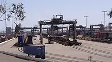 The port is served by the Alameda Corridor through which intermodal railroad cars go north to Los Angeles.