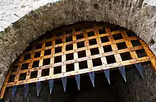 A portcullis (from Old French porte coleice, "sliding gate"[1]) is a heavy vertically-closing gate typically found in Medieval fortifications, consisting of a latticed grille made of wood, metal, or a combination of the two, which slides down grooves inset within each jamb of the gateway.