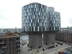 Portland towers are two former Aalborg Portland silos which have been converted into a BREEAM-certified office building in the emerging Nordhavn district of Copenhagen, Denmark. The conversion was completed in 2014 to design by Design Group Architects.