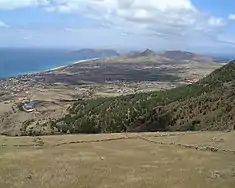 The island is characterized by two areas: the accidented northeast (mountainous, with rocky ledges and cliffs), and a coastal plain in the southwest (that includes a nine-kilometer long white sand beach, giving the island an advantage over neighboring Madeira). The mountainous northeast part of the island, consists of two geomorphological structures that includes:[10] an area of peaks, Pico do Castelo (437 meters), Pico da Juliana (447 meters), Pico da Gandaia (499 meters) and Pico do Facho (517 meters); and between the eastern coast and this area, a series of minor peaks, Pico do Maçarico (285 meters), Pico do Concelho (324 meters) and Pico Branco (450 meters). The southwest part of the island, although relatively flat, includes a series of elevations 100 meters in height or greater, such as Pico Ana Fereira (283 meters), Pico do Espigão (270 meters) and the Cabeço do Zimbralinho (183 meters). The slope of the western part of the island slopes from 150 meters to the south coast reaching the sandy beaches of Porto Santo. A third system, in the west-northwest, that includes Cabeço da Bárbara Gomes (227 meters) and Cabeço das Canelinhas (176 meters) is distinct from the areas identified. The island is encircled by an oceanic platform between 20 and 37 km2, with a minimum depth of 8 meters (Baixa do Noroeste), and limited by the flanks of a large submarine volcano.[11]