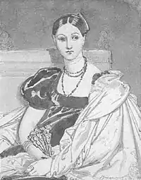 Portrait of Madame Duvaucey is an 1807 oil on canvas painting by Jean-Auguste-Dominique Ingres. It shows Antonia Duvauçey of Nittis, the lover of Charles-Jean-Marie Alquier, then ambassador to the Holy See. Duvaucey is positioned in a flat pictorial space, gazing frontally at the viewer, dressed in lavish clothing and accessories. The portrait is the first female portrait painted during the artist's stay in Rome.[1] Portrait of Madame Duvaucey is acclaimed for exhibiting her enigmatic charm, and as "not a portrait that gives pleasure..[but]...a portrait that gives rise to dreams".[2]