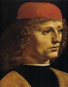 The Portrait of a Musician is a radical departure from the prevailing form of portraiture in 15th-century Milan.[29] The Milanese audience was more artistically conservative than others elsewhere in Italy,[30] and would have expected most, if not all, portraits to be in profile like those by Zanetto Bugatto, Vincenzo Foppa and Ambrogio Bergognone.[29] The sitter's three-quarter profile was already common in Early Netherlandish painting, where portraits were often set against a flat black background.[31] Antonello da Messina would introduce similar black background and three-quarter-view portraits in Venice and Sicily, with works like the Portrait of a Man (Il Condottiere) and the Portrait of a Man with a Red Hat.[32] Leonardo is likely to have been influenced by Antonello's style and could have seen that artist's work during Antonello's brief visit to Milan in 1476,[18] or in Venice around 1486, when Leonardo might have been in the city visiting his former teacher Andrea del Verrocchio.[4] The art historian Daniel Arasse suggested that while the Portrait of a Musician is the most similar of Leonardo's portraits to Antonello's, the figure is facing the viewer, in contrast not only to most of Antonello's portraits,[33] but also to Leonardo's other portraits.[34] The Portrait of a Young Man (c. 1490–1491) in the Pinacoteca di Brera by an artist in Leonardo's circle[n 8] was heavily influenced by the Portrait of a Musician.[26][35][36]