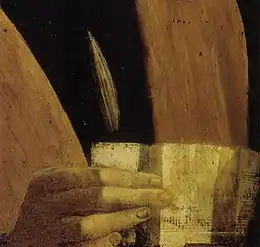 The stiffly folded piece of paper is held in an odd and delicate manner and is at least one part of sheet music, with musical notes and letters written on it.[2] Due to the poor condition of the lower part of the painting, the notes and letters are largely illegible.[2][3] This has not stopped some scholars from hypothesizing what the letters say, often using their interpretations to support their theory of the musician's identity.[20] The notes have offered little clarity into the painting,[5] other than strongly suggesting that the subject is a musician.[21] The partially erased letters can be made out as "Cant" and "An"[22] and are usually read as "Cantum Angelicum", Latin for 'angelic song', although the art historian Martin Kemp notes that it could be "Cantore Angelico", Italian for 'angelic singer'.[2] The notes are in mensural notation and therefore probably show polyphonic music.[14] Leonardo's surviving drawings of rebuses with musical notation in the Print Room of Windsor Castle do not resemble the music in the painting.[5] This suggests that this musical composition is not by Leonardo, which leaves the composer and the significance of the music unknown.[5]