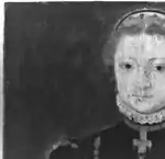 Her hair is not covered with the traditional white coif often seen in continental Europe, and particularly in the Seventeen Provinces at the time, which even rich merchant women would wear (such as in the Portrait of a Woman, of the Royal Museum of Fine Arts Antwerp, or also the Portrait of an Unknown Lady, holding a pomander on a Gold Chain of 1560 (see the gallery of portraits in the article about Pieter Pourbus). But she wears instead the fashionable French hood, particularly preferred by noble women, and in her case ornamented with pearls.
