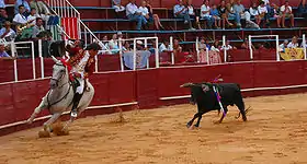 In 2001, matador Pedrito de Portugal controversially killed a bull at the end of a fight after spectators encouraged him to do so by chanting "Kill the bull! Kill the bull!"[7] The crowds gave Pedrito a standing ovation, hoisted him on their shoulders and paraded him through the streets.[7] Hours later the police arrested him and charged him with a fine, but they released him after crowds of angry fans surrounded the police station.[7] A long court case ensued, finally resulting in Pedrito's conviction in 2007 with a fine of €100,000.[7] In 2002, the Portuguese government gave Barrancos, a town near the Spanish border where bullfighting fans stubbornly persisted in encouraging the killing of bulls during fights, a dispensation from the 1928 ban.[7] In 2014, the same dispensation was granted to Reguengos de Monsaraz, where a festivity featuring the killing of bulls took place every year despite the ban; the annual event was then recognized as a tradition by a Beja Court, which guaranteed access to the exception.[8]