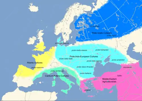 Starting in the 3rd millennium BC, during the Bronze Age, the first wave of migrations into Iberia of speakers of Indo-European languages occurred. These were later (7th and 5th centuries BC) followed by waves of Celts.[75][76] Major genetic studies since 2015 have now shown that haplogroup R1b in western Europe, most common in many areas of Atlantic Europe, largely expanded in massive migrations from the Pontic-Caspian steppe of eastern Europe during the Bronze Age, along with carriers of Indo-European languages like proto-Celtic and proto-Italic. Unlike older studies on uniparental markers, large amounts of autosomal DNA were analyzed in addition to paternal Y-DNA. An autosomal component was detected in modern Europeans which was not present in the Neolithic or Mesolithic, and which entered into Europe with paternal lineages R1b and R1a, as well as the Indo-European languages.[77][78][79]