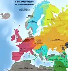 Y-chromosome haplogroup R1b is the most common haplogroup in practically all of the Iberian peninsula and western Europe.[72] Within the R1b haplogroup there are modal haplotypes. One of the best-characterized of these haplotypes is the Atlantic Modal Haplotype (AMH). This haplotype reaches the highest frequencies in the Iberian Peninsula and in the British Isles. In Portugal it reckons generally 65% in the South summing 87% northwards, and in some regions 96%.[73] The Neolithic colonization of Europe from Western Asia and the Middle East, beginning around 10,000 years ago, reached Iberia and most of the rest of the continent, although according to the demic diffusion model its impact was greatest in the southern and eastern regions of the European continent.[74]
