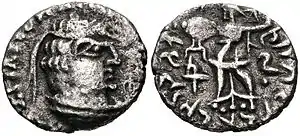 Coin of Agathocles. Obv Stupa surmounted by a star, Kharoshthi legend Akathukreyasa "Agathocles". Rev vegetal symbol and hirañasame (185-168 BCE).[10]